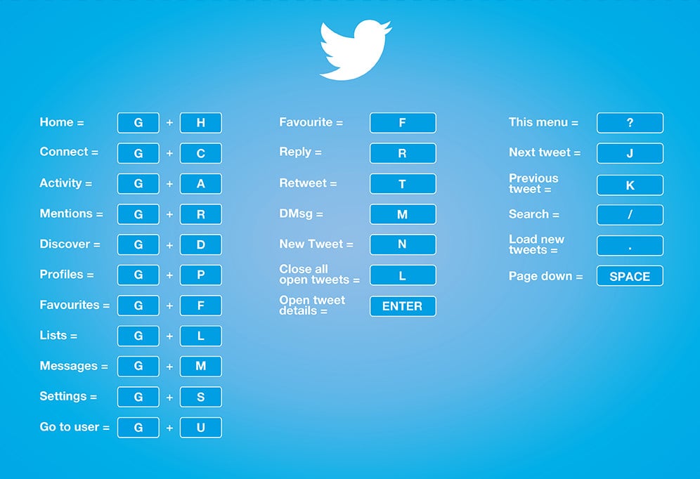 Here's a list of social media keyboard shortcuts for Twitter, Facebook, YouTube, Tumblr and Google +.